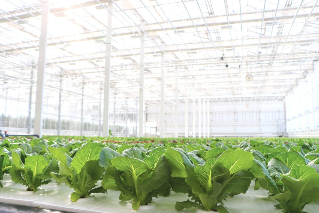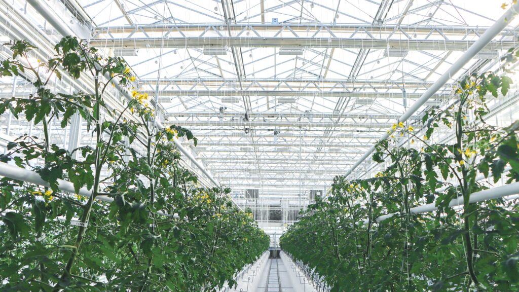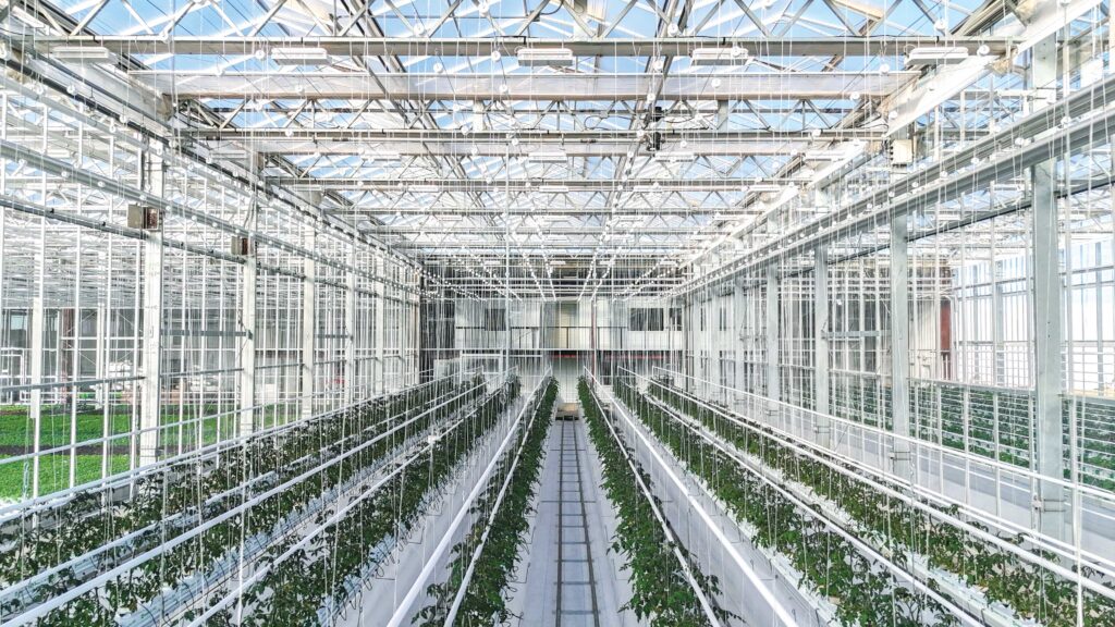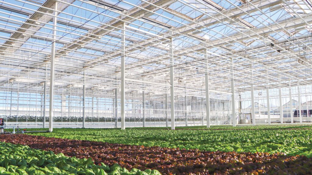 The greenhouse features approximately 25,000 square feet of dedicated growing space housed within a tall, open structure designed to promote uniform light distribution and a consistent internal climate. Constructed from hot-dipped galvanized steel and clad with 4 mm glass on all sides, the Venlo allows roughly 90% of natural sunlight to enter the growing area. Its increased roof height and expansive interior help create a more homogenous environment compared to other greenhouse designs, supporting efficient crop production across multiple partitioned bays.