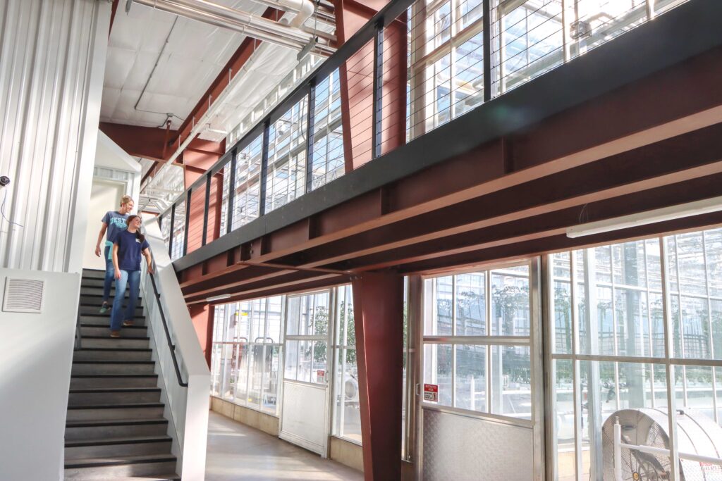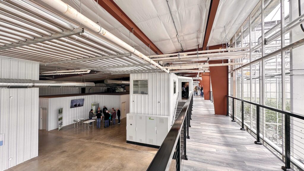 An attached, two-level headhouse adds more than 10,000 square feet of supplemental space to the facility. The lower level contains areas for harvesting and processing, mechanical equipment and storage, while the upper mezzanine includes office and conference space, along with a viewing platform overlooking the three growing zones. The headhouse was designed to support efficient daily operations and provide visibility into the greenhouse, without compromising plant biosecurity.